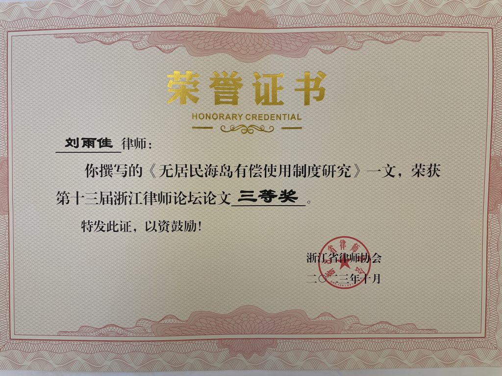 本所刘雨佳律师论文《无居民海岛有偿使用制度研究》荣获第十三届浙江律师论坛论文三等奖 时间:2023-10-21 10月21日,第十三届浙江律师论坛在台州市隆重举行。本次论坛以“高质量法律服务优化营商环境”为主题,旨在进一步引领全省律师增强大局观、服务中心工作,提升律师实务与理论水平。本所刘雨佳律师撰写的《无居民海岛有偿使用制度研究》荣获此次论坛论文三等奖。在新时代背景下,对于律师的业务能力以及律师事务所的发展方向提出了更高的要求。希望本所全体律师能充分重视理论研讨工作,不断学习,不断思索。在法律服务实践中不断总结经验,营造以实务提升理论、理论指导实务的良好氛围。