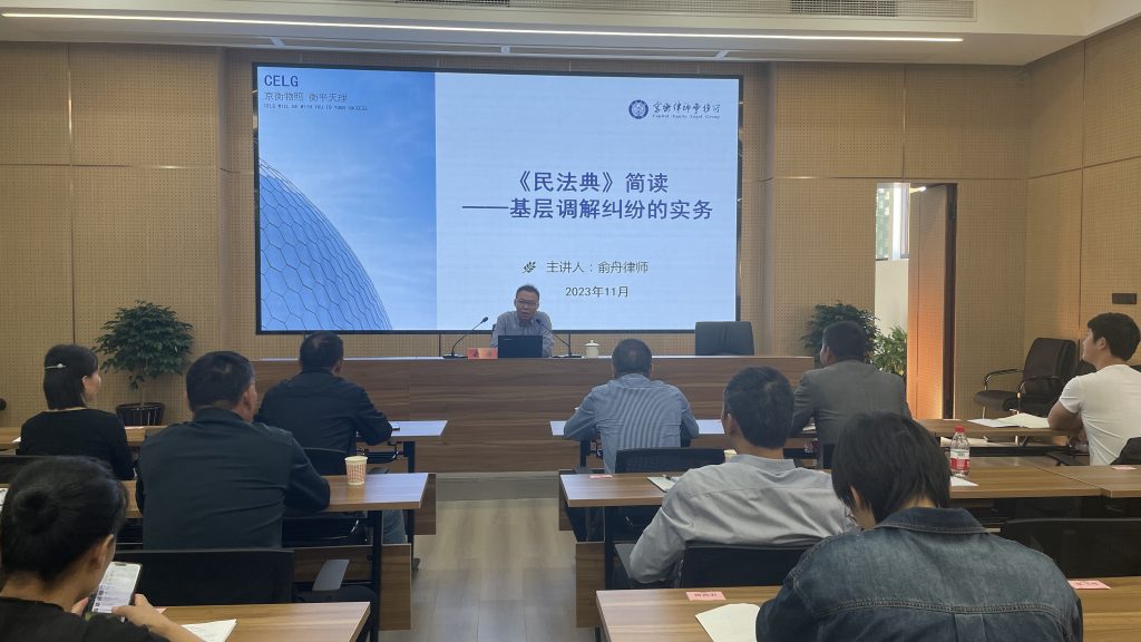 本所俞舟律师受邀开展《基层调解纠纷实务》普法讲座 时间:2023-11-02 11月2日上午,本所俞舟律师受小沙街道邀请,为该街道下辖的村干部、人民调解员以及新入职的大学生干部开展《基层调解纠纷实务》普法讲座,并对《民法典》的相关规定进行了解读。课上,俞律师选取了工作中较为常见的离婚纠纷、侵权纠纷、分家析产纠纷、赡养纠纷等案例,以案释法,讲述了各个案例中调解工作的要点。他强调,纠纷调解时应以“公平”、“合法”、“自愿”为基础,并注重运用调解技巧。讲座结束后,与会人员纷纷表示受益颇多,并希望能将俞律师分享的经验运用到今后的调解工作中,从而维护社会稳定。