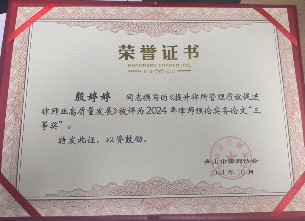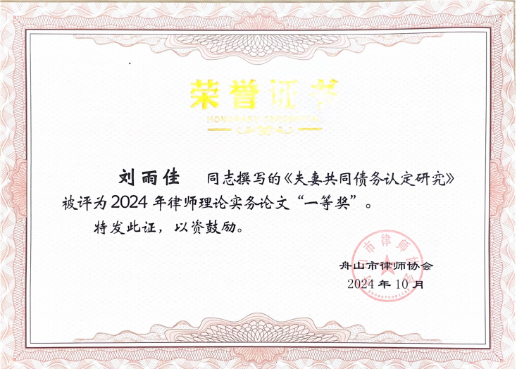 京衡浙江自贸区所律师获2024年律师理论实务论文奖项 时间:2024-10-08 10月8日,舟山市律师协会公布2024年律师理论实务论文获奖名单。此次论文评选共征集到45篇论文,经评审,共10篇论文获奖,评选出一等奖1篇、二等奖3篇、三等奖6篇。京衡浙江自贸区所2篇论文脱颖而出,分别是刘雨佳律师撰写的《夫妻共同债务认定研究》荣获一等奖;殷婷婷律师(实习)撰写的《提升律所管理质效促进律师业高质量发展》荣获三等奖。此次论文获奖,不仅是对京衡浙江自贸区所律师法律业务研究水平的认可,也是对京衡浙江自贸区所致力于专业化人才队伍建设的肯定。长期以来,京衡律师始终高度重视法律论文研讨工作,积极鼓励所内律师参与课题研究和论文撰写,以理论促实践,不断提升业务能力水平,为客户提供更优质的法律服务。