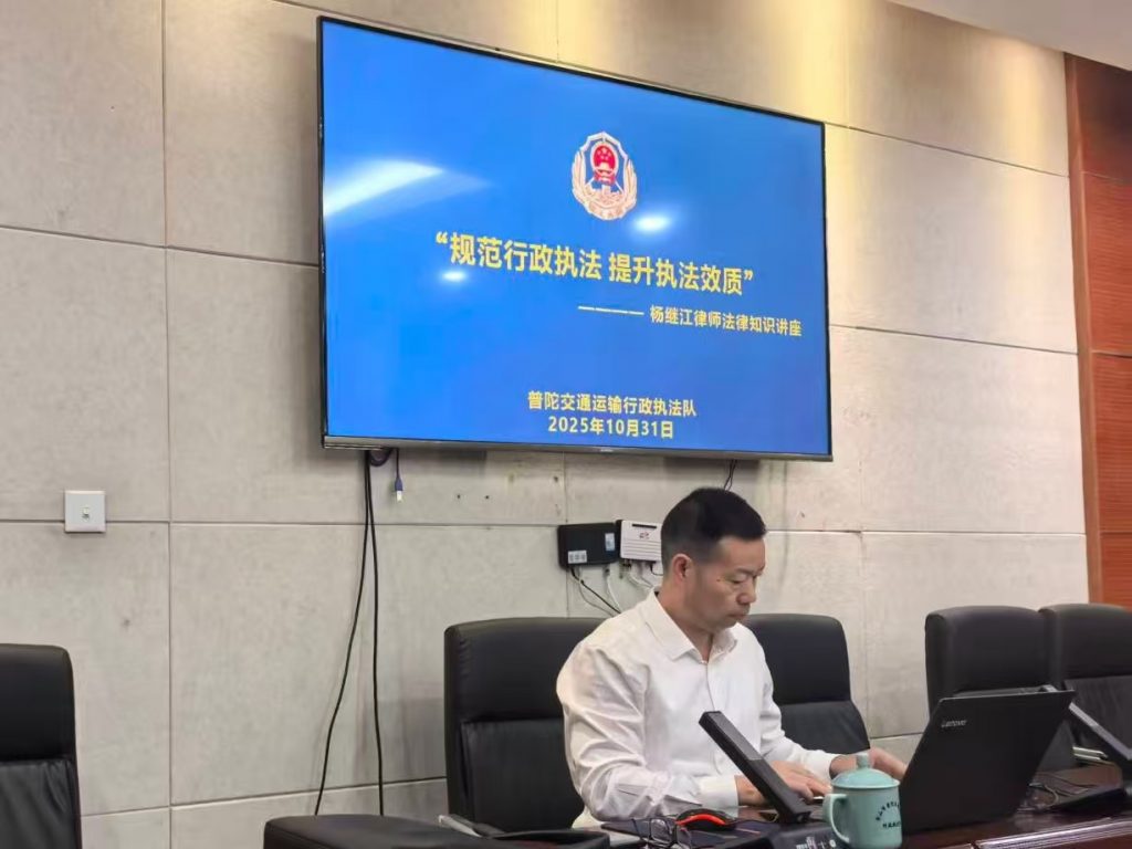 杨继江律师受邀为普陀交通运输行政执法队开展法律知识讲座 时间:2025-10-31 10月31日上午,本所杨继江律师受邀为普陀交通运输执法队开展法律知识讲座,旨在通过规范执法降低企业经营成本、保障市场公平竞争,进一步提升政府公信力与区域吸引力。本次讲座聚焦执法实践规范化,深入探讨其对优化营商环境与推动经济发展的积极作用。杨律师围绕交通运输行政执法的四大维度展开讲解,包括主要法律依据、执法原则、当前执法中存在的问题与困难,以及执法过程中的法律风险,并结合四个典型案例以案释法。讲座还设置了交流互动环节,杨律师就一线执法中常见的疑难问题进行了现场答疑与指导,现场反响热烈。讲座以“规范行政执法,维护营商环境”为宗旨,助力执法队伍提升专业素养,为区域企业发展保驾护航。未来,本所将持续深化与政府部门的法律协作,推出更多定制化普法服务,为区域营商环境的高质量发展注入法治力量。