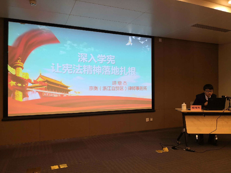 胡增杰律师为宁波舟山港舟山港务有限开展普法讲座 时间:2020-12-08 12月4日,本所胡增杰律师受邀为宁波舟山港舟山港舟山港务有限公司开展了《深入学宪 让宪法精神落地扎根》的普法知识讲座。在讲座中,胡律师对《宪法》前世今生、我国《宪法》的内容作了基本介绍,并通过警察体罚殴打罪犯案、浙江就业性别歧视第一案等案例着重解析了宪法监督和宪法司法化的诸多亮点。通过此次《深入学宪 让宪法精神落地扎根》普法讲座,使在场的听众们对《宪法》中的重要法条有了一定的了解。大家对本次讲座反响热烈,认为对其今后维护权利,处理纠纷有重要的指导意义。