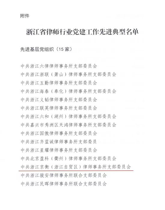 京衡律师浙江自贸区事务所党支部获评“浙江省律师行业先进基层党组织” 时间:2023-08-04 近日,省律师行业党委开展了全省律师行业党建工作先进典型评选表彰活动,经各市律师行业党委推荐,各市司法局审议,并经省律师行业党委研究决定,表彰浙江省律师行业党建工作先进基层党组织15家。京衡律师浙江自贸区事务所党支部获评“浙江省律师行业先进基层党组织”。京衡律师浙江自贸区事务所党支部始终紧紧围绕“服务群众,建设队伍”这一核心任务,以阵地建设为载体,多措并举,增强队伍的活力,提升队伍素质。支部创新活动形式,推行“智慧建党”,将党组织活动融入到律师日常管理、文化建设中,开展形式多样的主题党日活动,立足服务社会,履行担当义务。京衡律师浙江自贸区事务所党支部将珍惜荣誉,继续以党建为先,锚定中国特色社会主义法治工作者的职责定位,助力经济社会高质量发展、维护人民群众合法权益,争做党和人民满意的好律师,不断为推进律师行业高质量发展,奋力谱写中国式现代化浙江篇章贡献京衡力量。